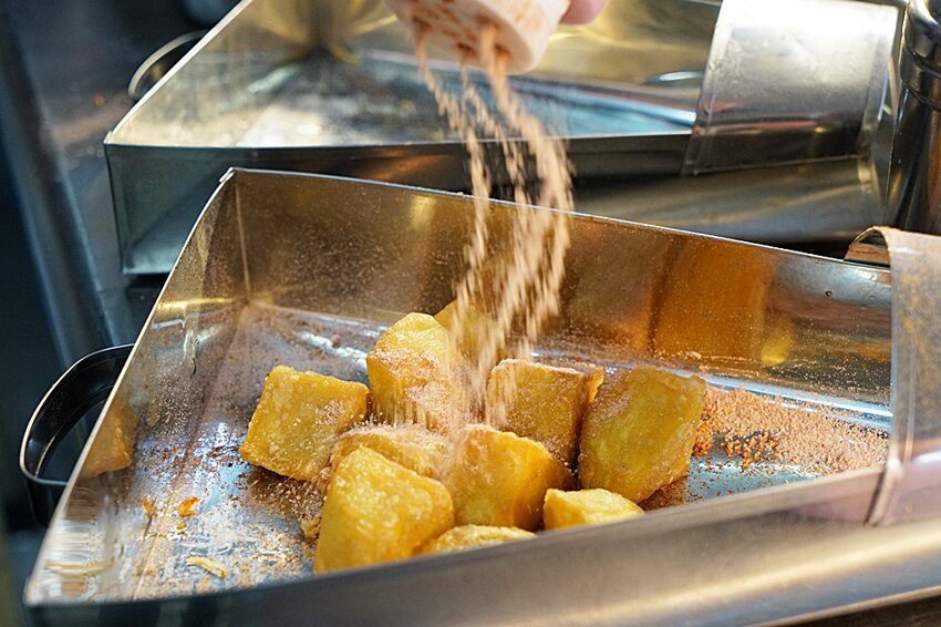 炸好的地瓜撒上甘梅粉,這動作宛如瀑布般的撒法超霸氣,在一旁都聞到香味囉!!