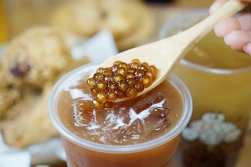 等咧粉圓家的粉圓都是自家生產,以以地瓜粉製作且不添加防腐劑以及化學添加物,口感特別軟Q,加上以寶山黑糖及砂糖蜜過,再咀嚼間可以感受到淡淡的黑糖香,加上自家生產也不會像市面上的珍珠或波霸放了一段時間就會變硬,不管是搭上哪一款奶茶或是鮮奶茶風味都很讚,加上粉圓本身有蜜漬過,會建議微糖或半糖來喝嘟嘟好~