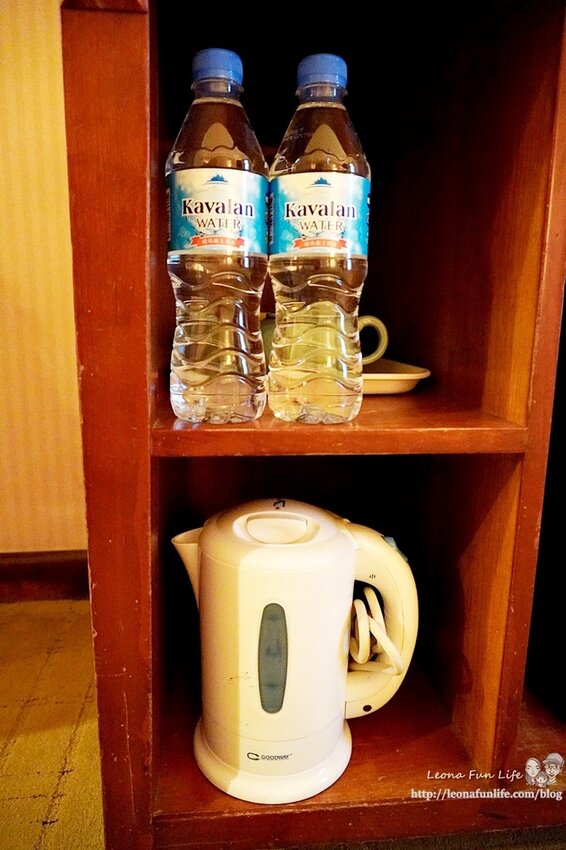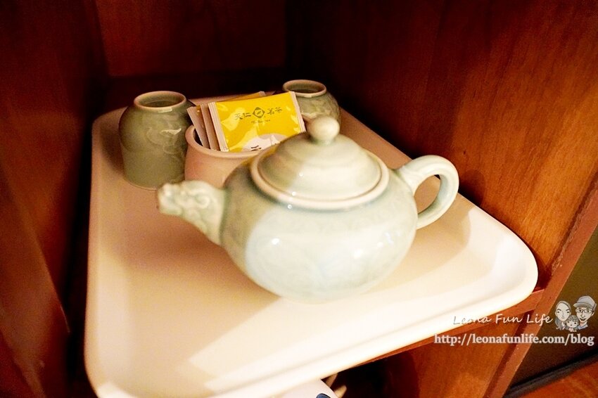 附上了礦泉水、泡茶的小茶壺、茶包跟熱水壺,