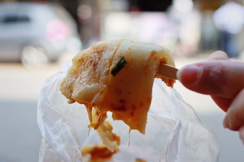 逛三義市場本來要去品嘗看看目鏡麵食,但生意真的太好,完全找不到可以容下我們一家三大兩小的座位,就只能先放棄去吃吃別家的小吃美食,走逛到我們看到這家三義久松水蛋餅,好奇著就覺得買來吃看看。