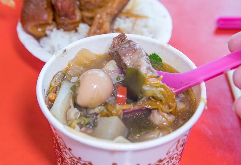 基本上這一碗菜尾味道是對的,就是少了以前真正菜尾的混濁和油香,那味就像佛跳牆和西魯肉、菜羹湯的混合體。如今這一碗(兩鍋混在一起)明顯單純、乾淨得多,主要的湯底感覺是以扁魚為主,裡面的食材非常多,多到無數細數,也確然各自有滋有味,豬片、排骨、豬肚、魷魚、鳥蛋、蘿蔔、筍干、香菇、金針、白菜、芥菜等等等.....在網上分享時有人說以前的菜尾比較好吃,這點我不敢確定...畢竟現在如果真把那些剩菜全倒在一起,你未必敢、想吃....。