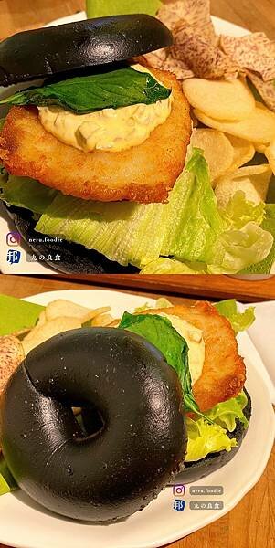手工魚蝦蟹炸餅-黑貝果堡 $260