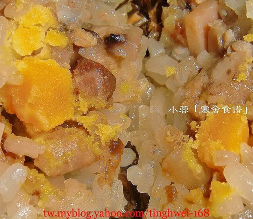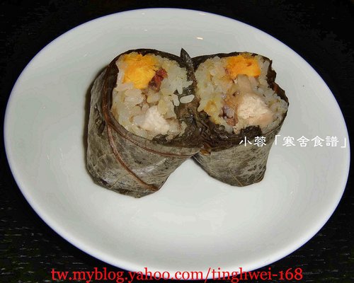 帶有荷葉香氣的糯米飯還包有雞肉、蛋黃、香菇等配料