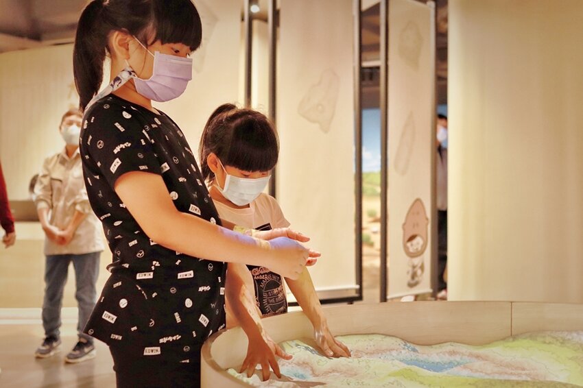 這個展場的亮點還有互動式動力沙盒讓大朋友小朋友可以親手堆疊出各式景觀;回到史前生活來進行虛擬弓箭狩獵比賽遊戲;還有讓大家可以置身在考古發掘現場的探坑3D彩繪,可是大園尖山考古展示館的最佳拍照打卡點等。