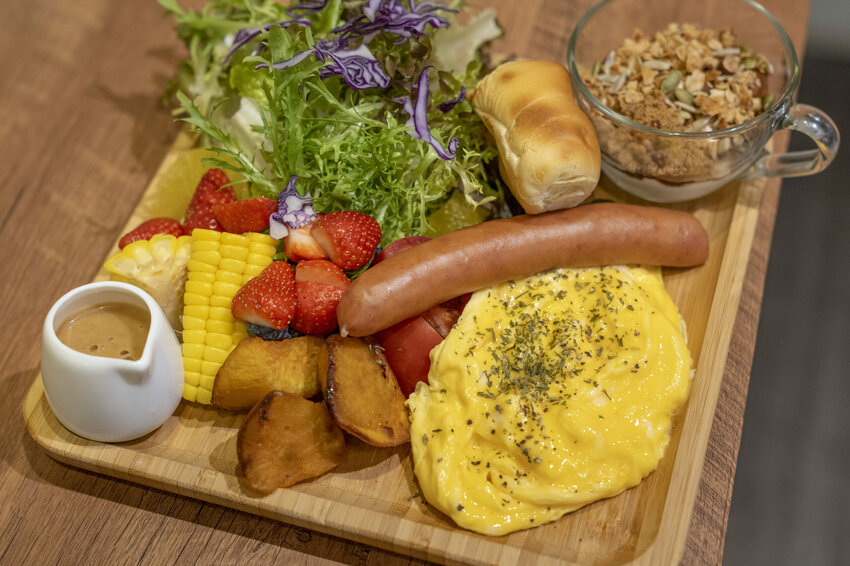 香腸、沙拉、炒蛋、優格、玉米、草莓,一人份量來說這真的會吃得很撐噎