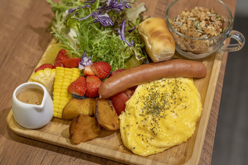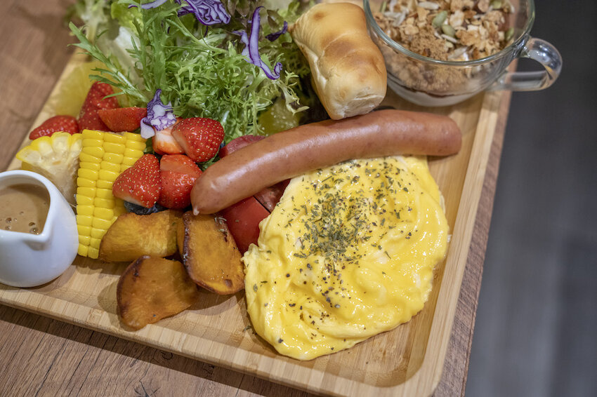 除了草莓系列以外,鹹食的部分也非常值得嘗鮮,木易子早午餐裡有香腸、 酪梨 、沙拉 、炒蛋 、小杯優格和吐司,整份相當豐富,吃起來也很有飽足感喔!