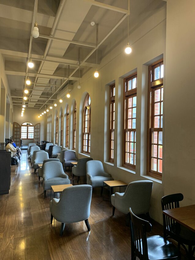 內部挑高的圓拱結構與紅磚縷雕圓拱窗,再配上超大片的星巴克Logo的窗貼,採光極佳卻又不刺眼,真的好適合放置我的放空靈魂喔~