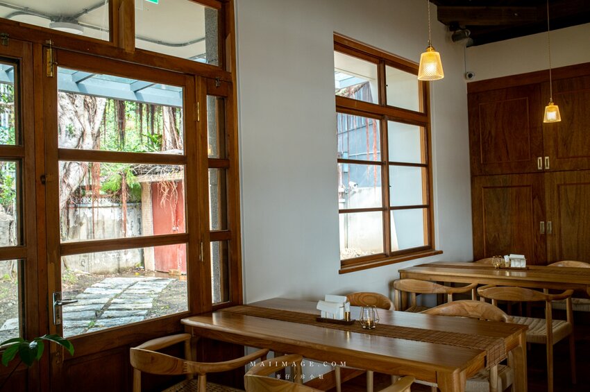 ▲店裡的日式洋小屋屋架、木屋架構造是現今少見的近代風格。建築除了還原其歷史樣貌,並打造可近眺淡水河之絕佳視野觀景庭院,成為淡水古蹟觀光旅遊亮點。這裏同時也是『時光樹影河岸景觀餐廳』的室內用餐區,這裏也是前面提到的歷史古蹟建築前基隆港務局淡水宿舍,木質的窗台跟桌椅再搭配氣氛吊燈讓整個空間相當有質感。