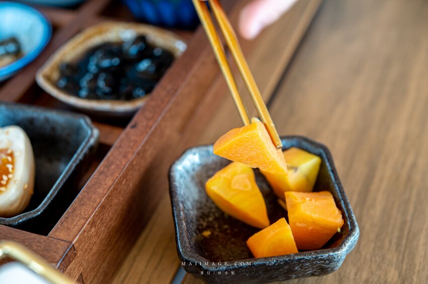 ▲搭配的六款養生小菜不定期也會調整,這天吃到有在地小農的地瓜、橄欖油漬番茄、胡麻秋葵、柚香蓮藕、海帶結跟黑豆。