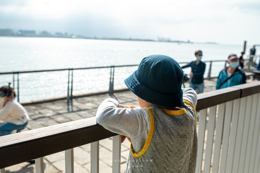▲小麥仔一到這環境就說這裡好棒,果然識貨。靠著欄杆望出去就是淡水河景,陽光充沛完全不冷實在很適合好好欣賞風景。看著步道上的行人跟自行車來往,下次可以來淡水安排個自行車一日遊。