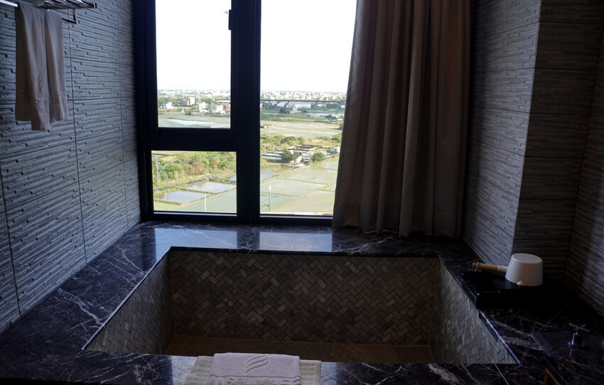 川湯春天旗艦店一共有11層樓,11樓是湯屋景觀房,泡湯區緊臨窗邊,可以邊泡湯邊欣賞美麗的蘭陽平原,這次袁彬因為帶著母親一同出遊,選擇無障礙空間的友好房,