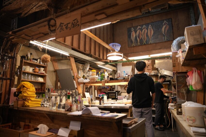 開放式廚房,內部老建築油煙設備完善,木頭以及擺飾