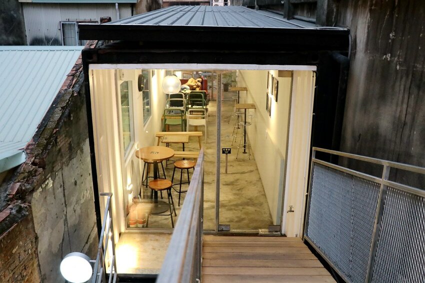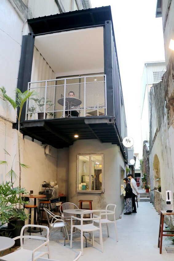 兩層樓高的貨櫃屋生存在兩棟建築物的夾縫中