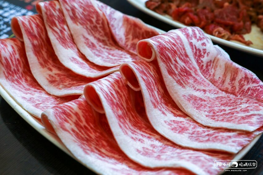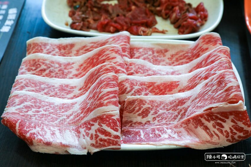 組合的安格斯牛小排,略帶厚度的牛肉片,波浪模樣實在迷人,粉嫩油花企圖使人流口水。