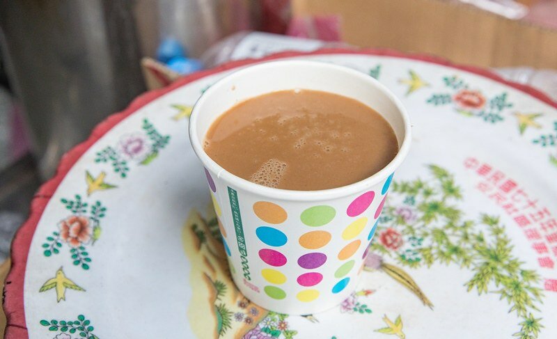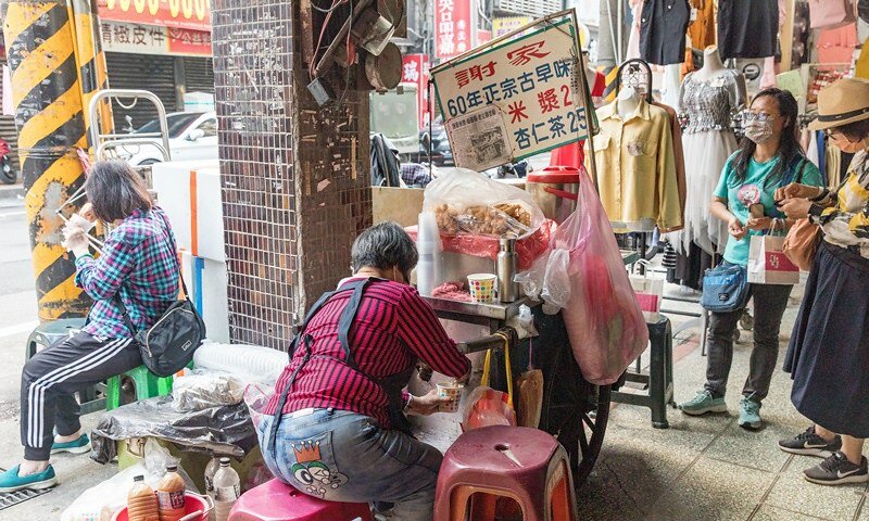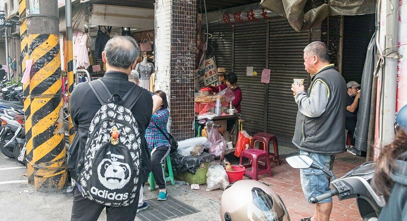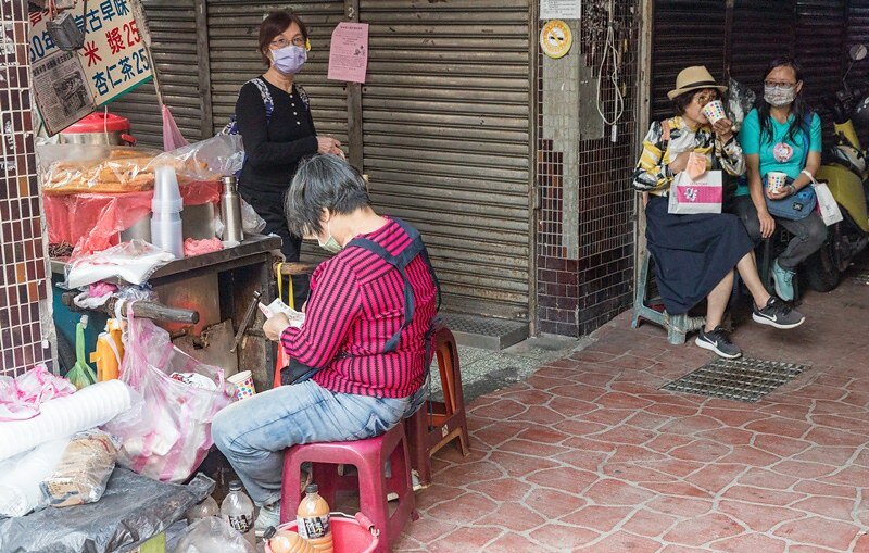 貼心的大姐也會準備一些塑膠椅供客人休息,大伙就這麼站著、坐著,依著,也就一甲子過去了,說它是許多基隆人的下午茶那可真是一點也不為過,可惜的是以前同樣在廟前的阿伯台灣漢堡已然不復見,以前我總是一杯米漿一份台灣漢堡。