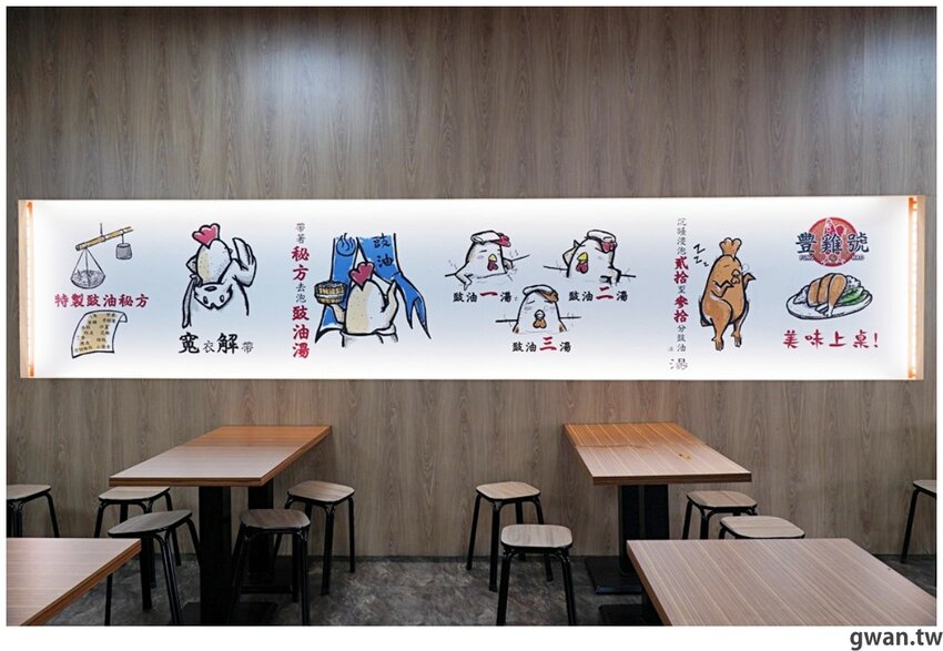 要做出好吃又道地的港式油雞,除了秘方很重要外,還需要反覆浸泡豉油湯滷製,多道工序才能讓油雞軟嫩又入味,牆上有製作過程的漫畫,還蠻可愛的