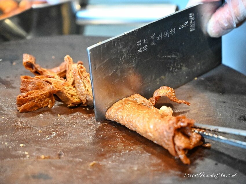珍東山鴨頭除了東山鴨頭,糖糖超推薦他們家的招牌豆皮,口感有別於一般外面東山鴨頭吃到的豆皮,看老闆這炸法就知道很特別,切塊的時候還會發出清脆的聲響