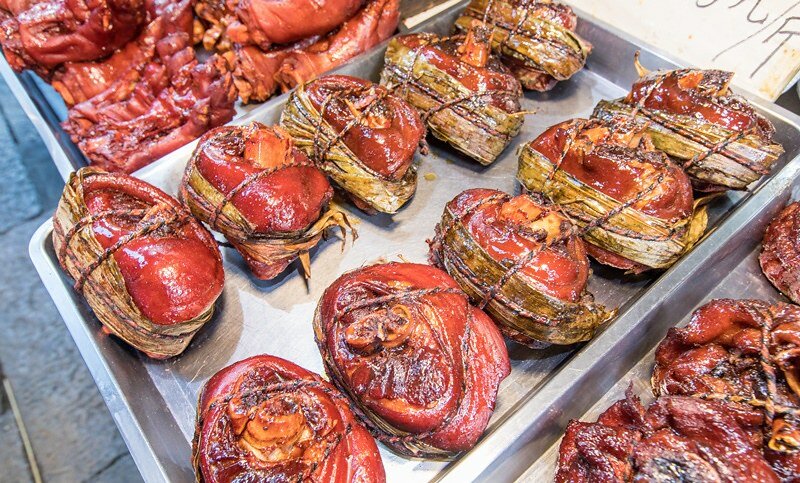 不過,後來我們拍豬蹄不好邊走邊吃,倒是買了一塊東坡肉,本來以為醬色這麼濃會很鹹,結果居然是甜的,後來想想這裡畢竟是上海,況且入口即化的口感還真是相當不錯,就是瘦肉有一點點柴就是。