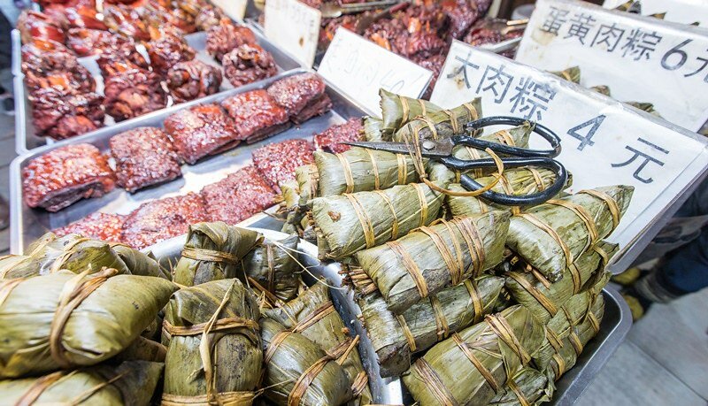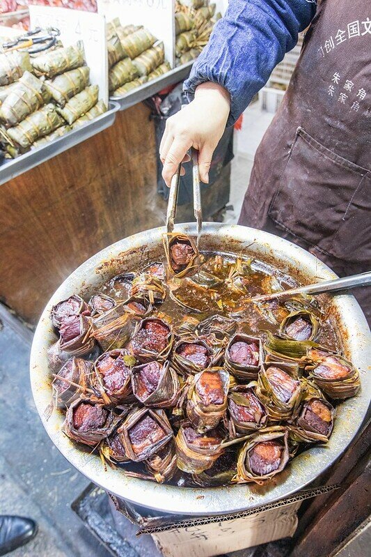 朱家角的粽子主要的是鹹蛋黃肉粽,大肉粽,豆沙,蜜棗等,買了一個大肉粽內餡和台灣差不多,口味夠油夠鹹了一點,但整體來說算是好吃。