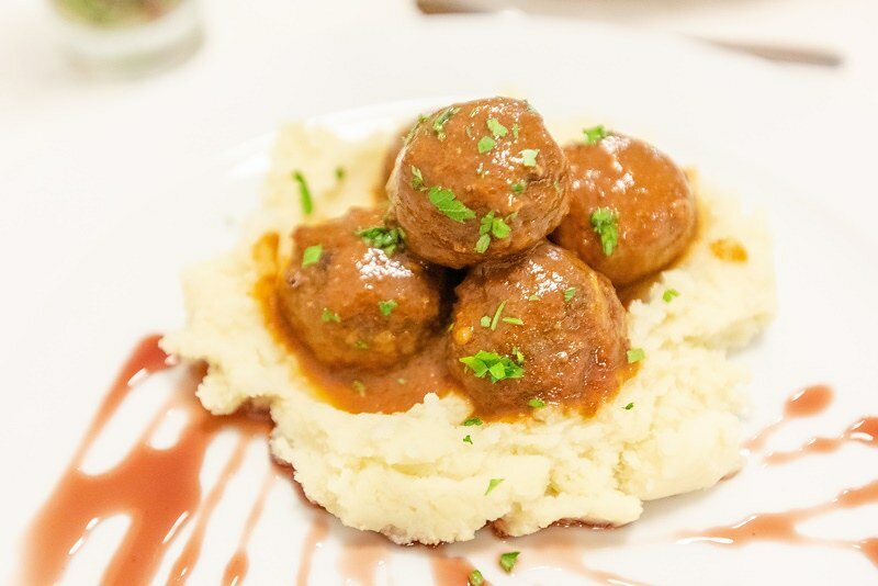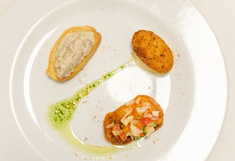 說是西班牙燉肉丸子,但我吃不出是什麼肉,後來翻譯幫我們問了,據說裡面有三四種不同的肉,有豬、羊、鹿等,底下則是很綿但有一點點乾的馬鈴薯泥,調味的醬汁很濃醇,同樣有略鹹的後端味覺,配上馬鈴薯倒是蠻搭的,淋上的醬汁有一點點酸度,也帶著一點點酒香。