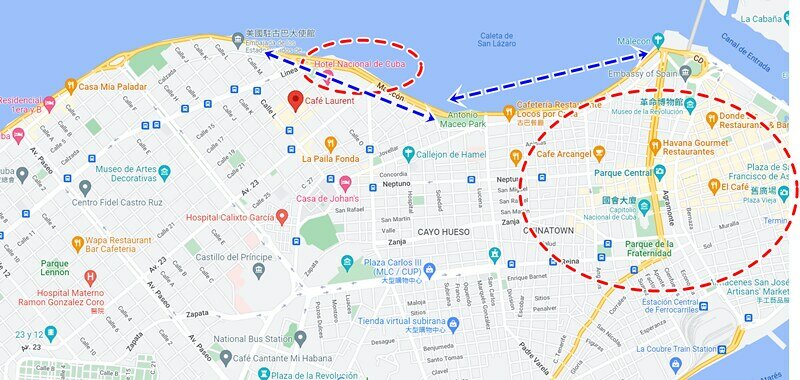 Café Laurent位於觀光客最多的馬雷貢大道邊上,不遠處便是古巴門面級的飯店國家飯店(Hotel Nacional de Cuba),離世界遺產的舊城區有一段距離。