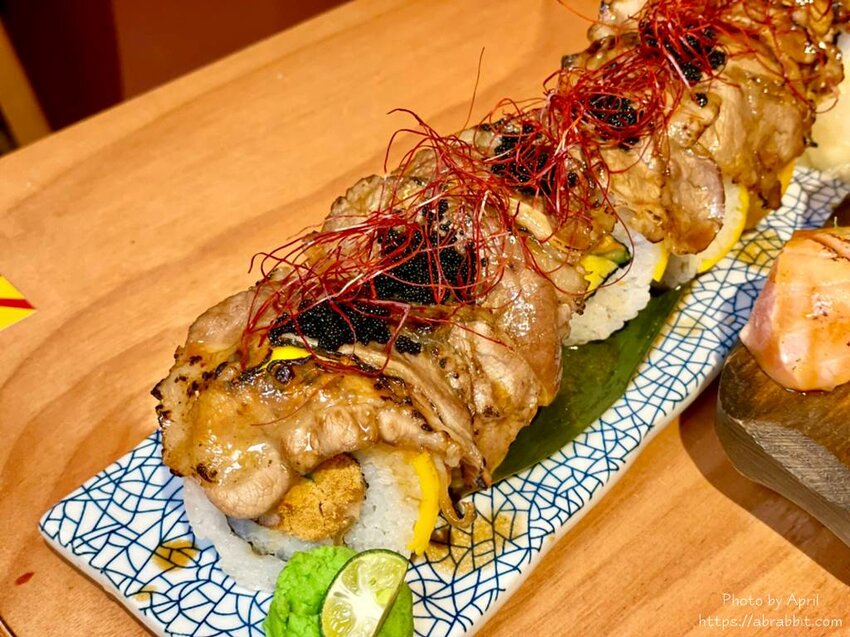 花壽司系列也不遑多讓,這個起司牛肉捲壽司上頭鋪上炙燒牛肉,還有魚子醬在上面,最後有辣椒絲作為點綴,視覺上看了顏色超美,非常享受啊!
