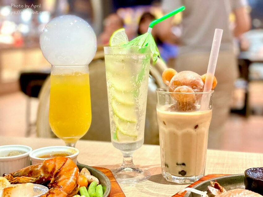 不得不說飲料實在是太吸睛了!左邊的海綿寶寶端上桌之後,還有有專人來桌旁服務吹泡泡!這個香香甜甜的泡泡搭配底下的氣泡飲非常讚呢。