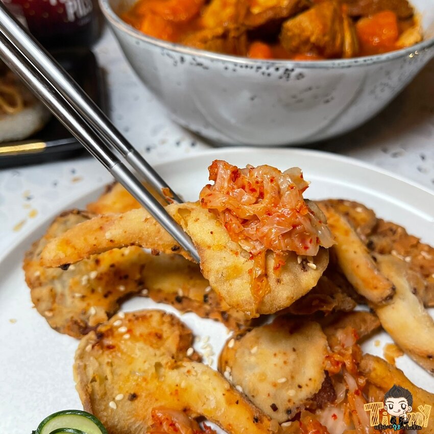韓式炸咕咕(190元),這個很適合當下酒菜。炸的有多汁的杏鮑菇帶點微辣的風味,搭配啤酒是美妙的組合。泡菜有辣味的甘甜,搭配炸物吃也不錯。