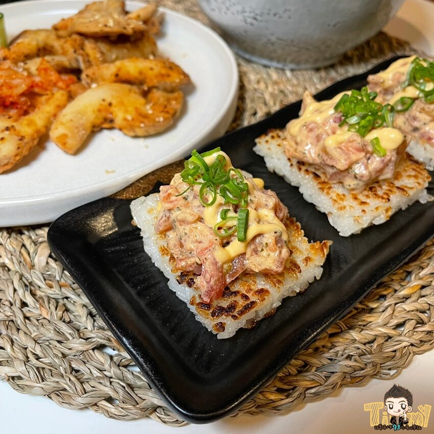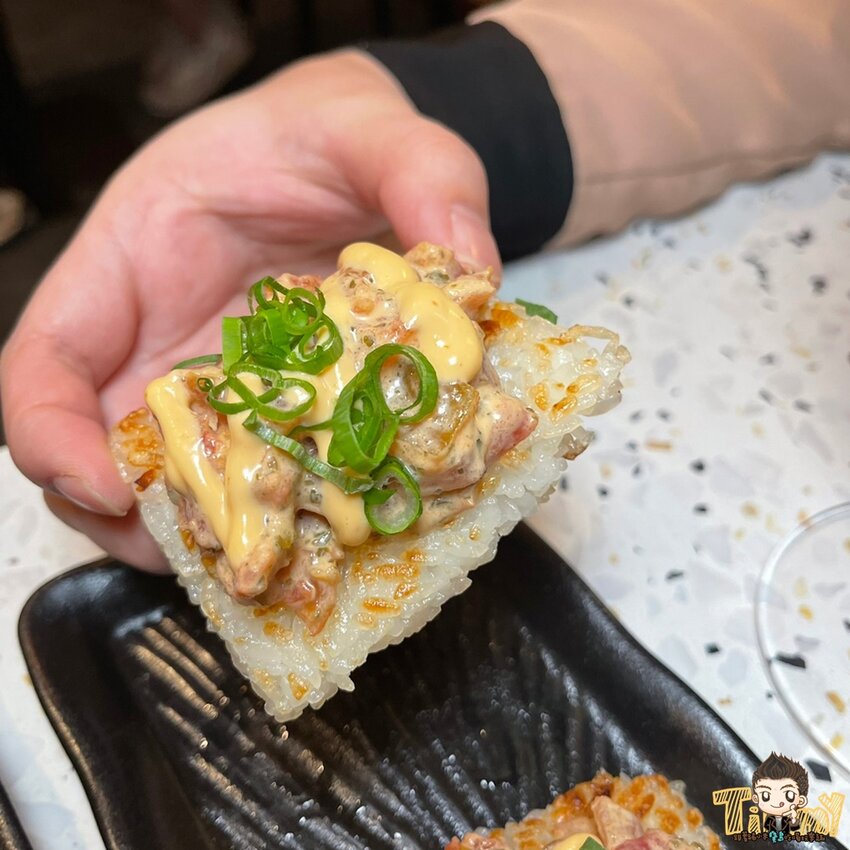 基底米飯有點像鍋巴飯酥脆帶軟Q的口感,上面是以番茄及特殊醬料去調味,呈現出來的風味很像鮪魚,所以稱之為偽魚。