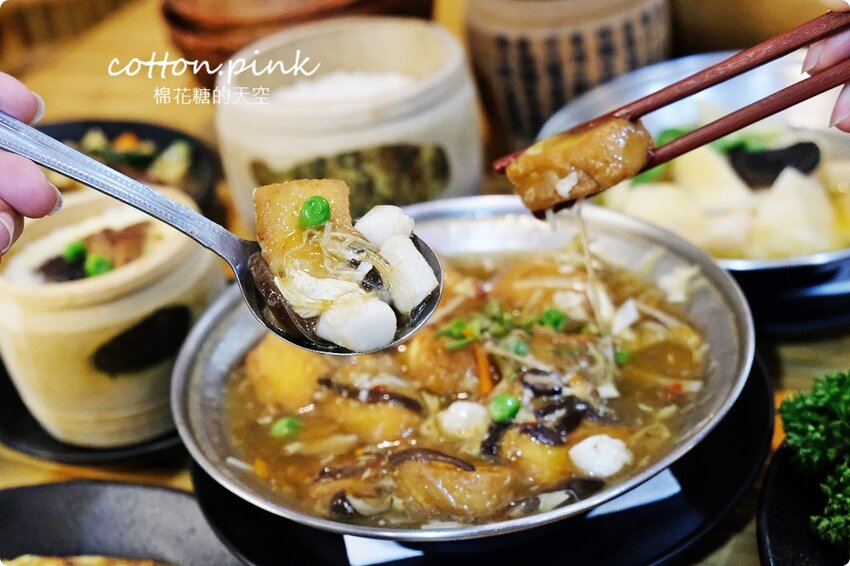 適合拌飯的還有這一鍋干貝豆腐煲,先把嫩嫩的雞蛋豆腐炸到金黃~再下鍋和醬汁一起燴煮,最後還要加上Q彈的小干貝增加海味,挖起一勺淋在飯上~真的可以多吃好幾碗飯了啦!