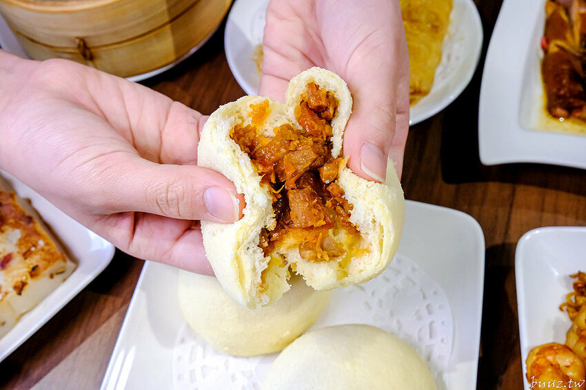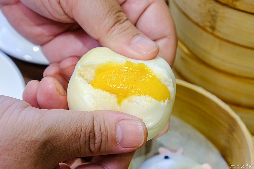 蓬鬆的包子,裡頭是鹹蛋黃與奶油的奶皇餡料,吃起來有著濃厚的鹹蛋黃奶香滋味,而且雙手剝開就能吃到爆漿的奶皇餡,非常推薦~