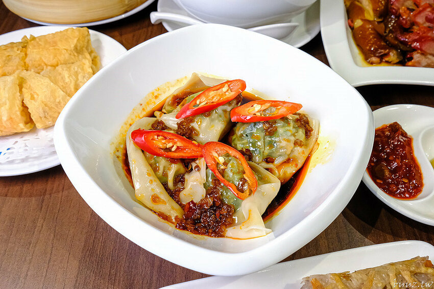 紅油抄手一份有4品,紅油是自製的辣椒醬,內有烏醋、蠔油、花椒等醬料,滋味嘗起來有點酸酸辣辣。