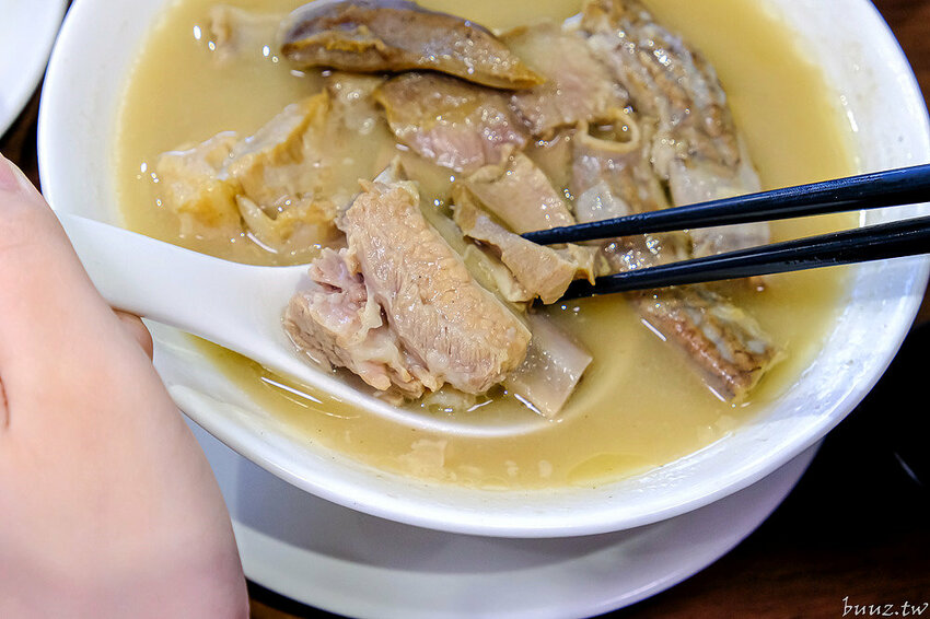 肉骨茶的湯頭沒有那麼明顯的胡椒氣味,屬於溫和蒜味的燉肉湯配上一些豬舌、粉腸及排骨,排骨燉得相當的軟嫩,輕輕一咬就能骨肉分離,很適合配白飯吃。