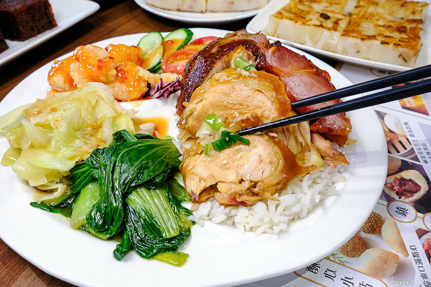 剛剛看到掛在櫥窗內的燒臘油亮油亮的,店內燒味可以單點也能做拼盤,這天燒味拼盤點的是蜜汁叉燒、油雞跟燒鴨三種口味。