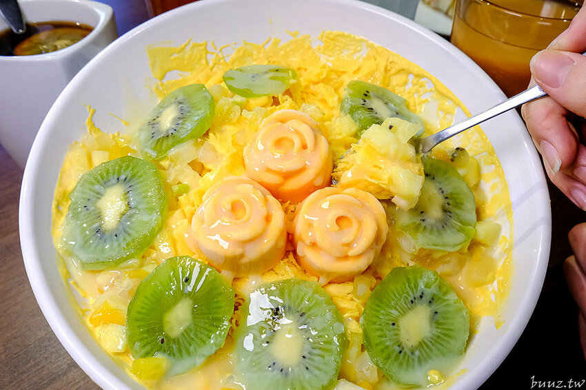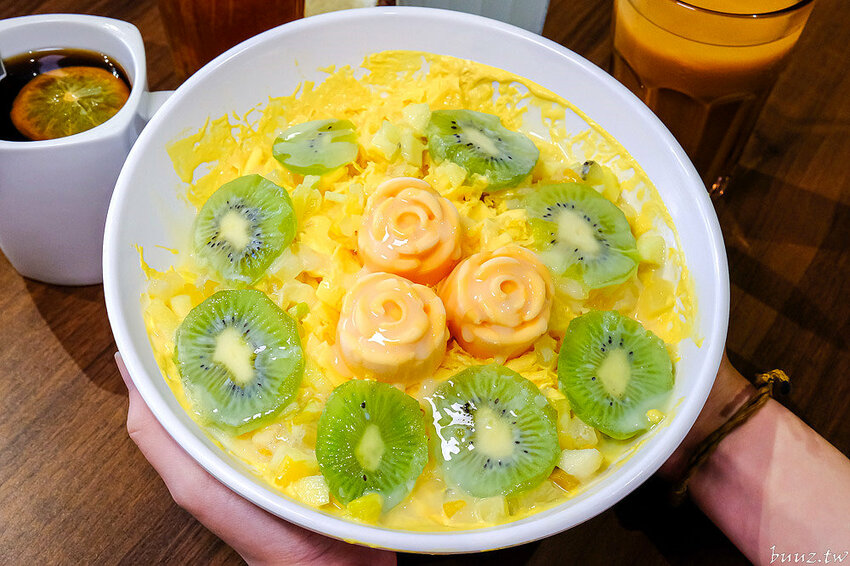楊枝甘露雪花冰則是將印象中的楊枝甘露弄成雪花冰型態,搭配玫瑰花造型的芒果冰、奇異果切片、水果丁及煉乳,繽紛又超大盆的雪花冰大概是4-6人的份量。