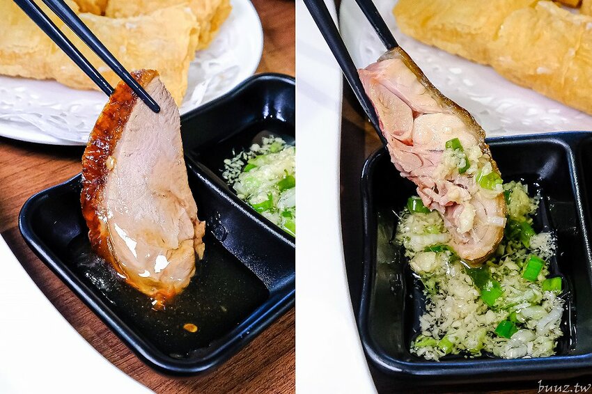 叉燒吃起來帶有蜜汁香氣,燒鴨本身帶點燻烤香沾微酸冰梅醬更能襯托鴨肉甜;油雞搭配店內自製的油蔥,香鹹油蔥更能凸顯滑嫩油雞的甜味。