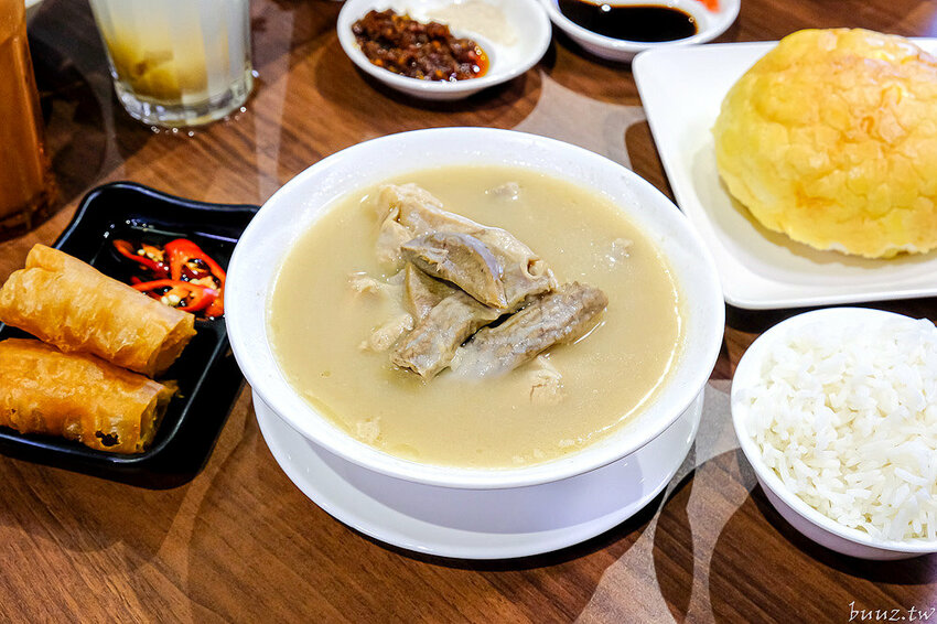 連新加坡肉骨茶這邊也有,肉骨茶使用特製滷包搭配中藥、胡椒粒去燉煮肉骨茶,這邊還會附上白飯跟油條讓客人搭著吃。
