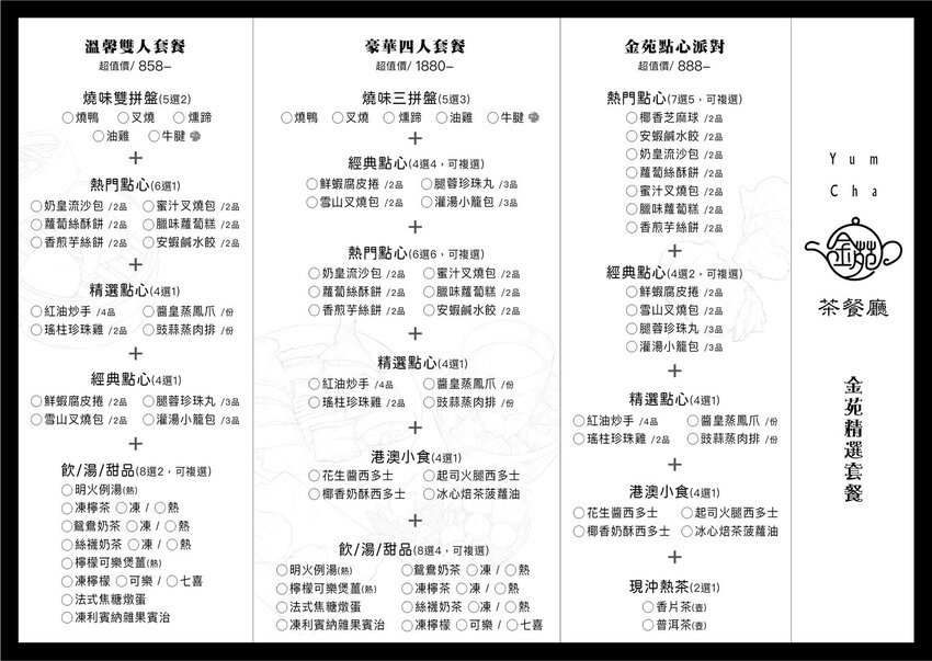 背面則是搭配好的套餐,雙人、四人套餐將各類熱門的品項納入其中,如果只想吃港點也有點心派對可以點哦~
