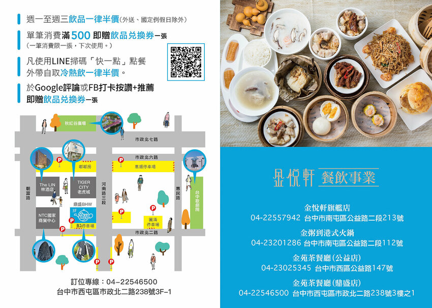 目前金苑茶餐廳鼎盛店最新活動如下(限鼎盛店),週一至週三點飲料有半價優惠,透過LINE掃碼「快一點」點餐也有優惠,再來就是消費滿額或是評論也有送飲品兌換券,有興趣的朋友可以多多利用平日相約吃金苑茶餐廳。