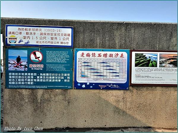 ▲入口的石牆上有《老梅綠石槽》的潮汐表,地質形成原因,以及注意事項。