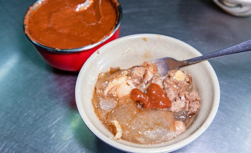 基本上這肉圓的調味上桌時就十分美味,但還是照著網路上在地人的說法,添點辣椒醬(據說還有蒜泥,但我這桌上沒有),果然這辣椒醬有一種獨特的香味,辣到是不見有多辣,總之加上一匙的確增添了美味。
