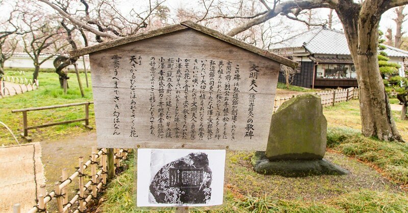 文明夫人(徳川斉昭夫人)の歌碑,相傳是德川齊昭的夫人(貞芳院)在弘道館落成時來此賞花留下的詠詩歌碑。