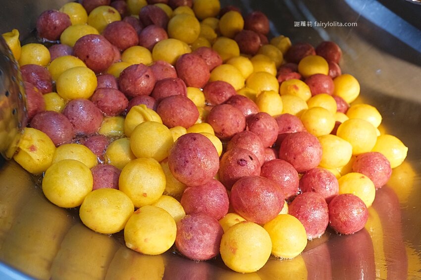 瞧瞧這炸出來的模樣,一顆顆圓滾滾的,是不是非常誘惑人,目前它們家的地瓜球總共有兩種,一種是黃色地瓜球跟紫色地瓜球,兩者皆來自彰化,這裡也是有名的地瓜產地之一。