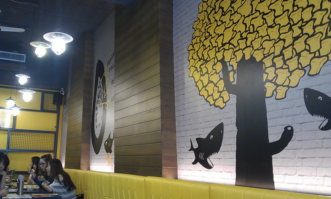 首先,看到店內整體裝潢以黃/黑色系和鯊魚塗鴉為主軸,