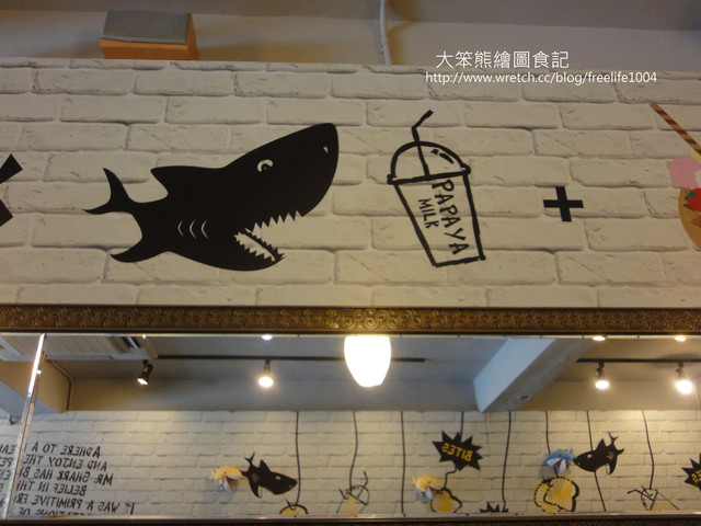 抬頭看,牠們的牆面貼滿了 鯊魚和吐司