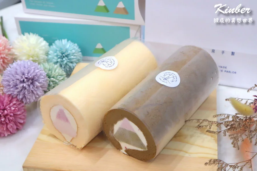 這款櫻花季的阿里山沏一壺茶雪糕捲的蛋糕體是用紅玉紅茶做的蛋糕體,內餡外圈白色部分是鐵觀音生乳餡,粉色山尖部分是綜合莓果生乳餡,綠色山底部分是鐵觀音生乳餡,鐵觀音部份冰凍的時候吃起來很像抹茶,口感非常濃厚好吃。
