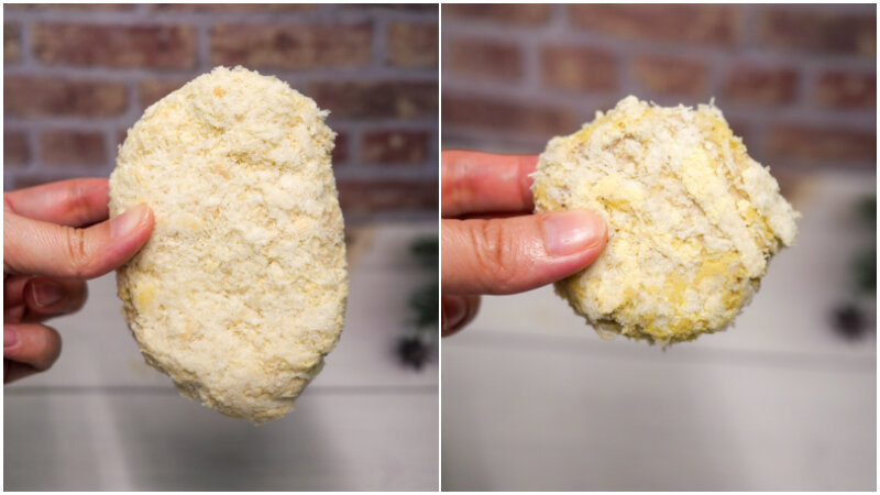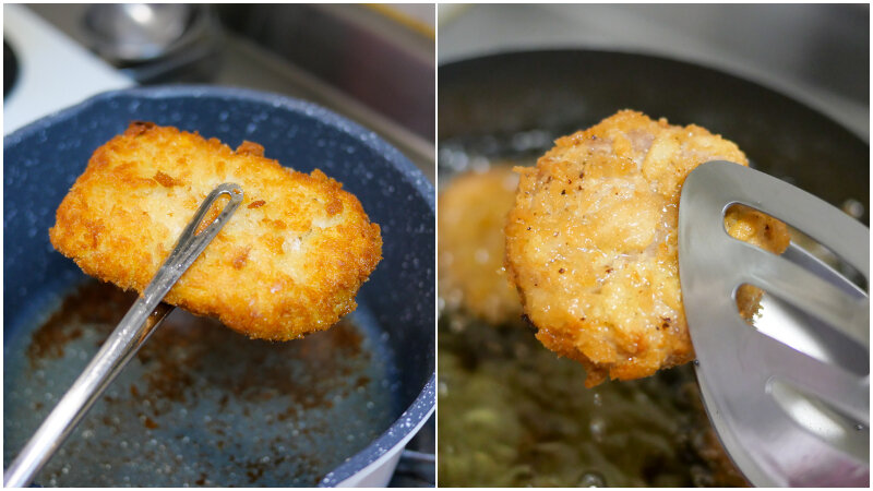 放入銀座杏子日式豬排、芋泥起司可樂餅以中(小)火煎炸至熟透浮起,即可食用