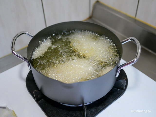 炸豬排、炸可樂餅烹調的方式很容易,不用退冰,直接下鍋炸即可,油鍋先倒入適量的油,預熱至150℃-180℃