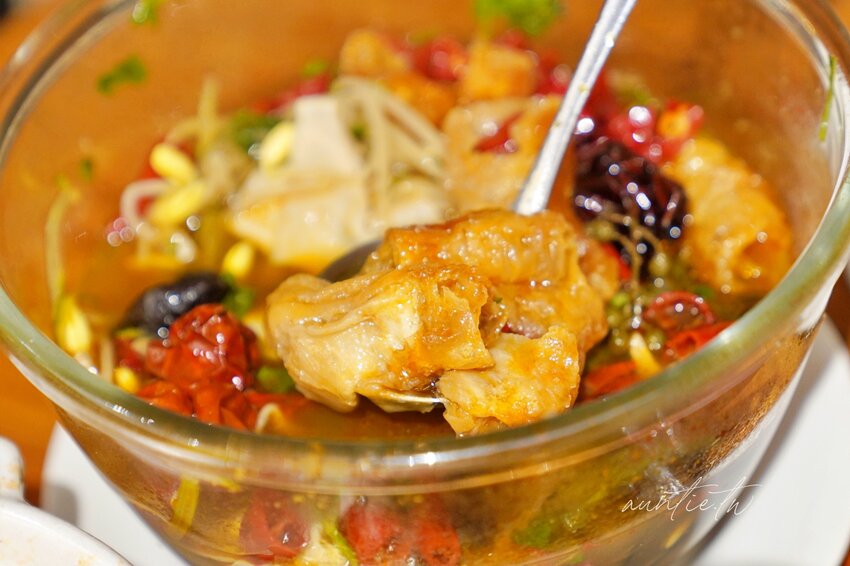 不得不說,雖然這水煮牛看起來紅通通的,看起來非常重口味,但是吃起來意外的爽口,完全是香濃順口可以喝光光沒問題的美味湯頭。水煮牛的配料很豐富,凍豆腐、黃豆芽、素牛肉片、木耳,煮得好入味,再加上脆口油條吸收滿滿湯汁,會忍不住一直想喝湯。