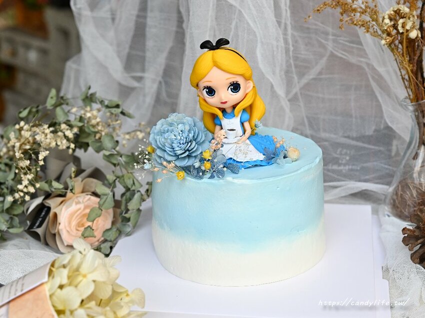 將小朋友們最愛的愛麗絲結合花藝,不僅活潑可愛,又帶點浪漫唯美的氛圍,蛋糕最外層可以選擇北海道鮮奶油(可做成無糖)或低糖義式奶油霜,中間的海綿蛋糕是採用全蛋作法,仔細看氣孔會比一般生日蛋糕來的大一些